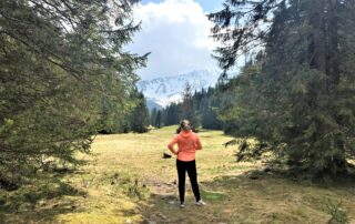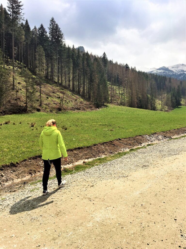 Gdy tylko weszliśmy na szlak to stał się cud – ludzie natychmiast zniknęli. Serio, tylko oddaliliśmy się o jakieś sto metrów od schroniska, natychmiast zostaliśmy sami, otoczeni ciszą, a za naszymi plecami wyłoniły się majestatyczne, ośnieżone skaliste górskie szczyty. Gdy Ewelina zaczęła robić skłony i rozciągać się przy użyciu pnia to zrozumiałem, że raczej nie zawrócimy.